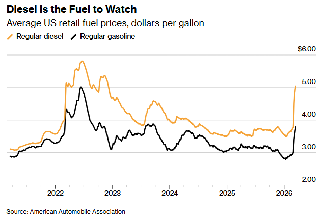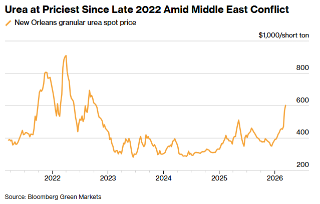 Fertilizer prices have surged, particularly for nitrogen-based urea that’s heavily used by corn growers concentrated in the Midwest. Spot urea prices climbed 28% in just two weeks, hitting the highest level since early in the Ukraine War. Attacks on Middle East shipping are threatening supplies, with a third of the world’s fertilizer shipments passing through the Strait of Hormuz, according to the United Nations. Diesel fuel, meanwhile, is up 33% since hostilities began through Sunday.