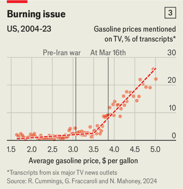 Least popular of all will be the rise in petrol prices, which glare down at Americans whenever they pass a service station. Neale Mahoney, Ryan Cummings and Giacomo Fraccaroli, a trio of economists at Stanford University, find that once prices pass $3.50 per gallon, media interest in the topic explodes (see chart 3). They are already nearly $4, up from less than $3 before the war. If the Strait of Hormuz stays shut and oil prices jump again, $5 is not out of the question.
