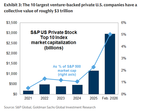 One factor motivating the potential changes to index inclusion rules is the unprecedented size of the private companies reportedly considering near-term IPOs. According to S&P, the constituents of the S&P U.S. Private Stock Top 10 Index have a collective equity value of nearly $3 trillion, equating to roughly 5% of market cap for the S&P 500. Prediction markets show substantial probabilities that several of those companies go public this year. Each of the three providers has noted the desire to maintain indices that represent the broad universe of relevant public US equities.