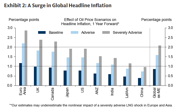 Higher energy prices will boost global headline inflation sharply in the next 1-2 months. Although the impact should partly reverse once the Strait does reopen, our country-specific rules of thumb imply that the shock will add 0.8pp to global headline inflation over the next year under our baseline and 2pp under our severely adverse scenario. Our estimates are biggest in Europe because of the added shock to home heating costs and power bills from higher natural gas prices, and smallest in China which relies more on coal and electricity than on oil and gas in transportation and home heating.