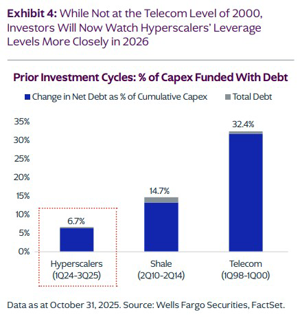 A good chart from Henry McVey's team on how hyperscaler debt measures up to past spending cycles in Shale and Telecom...