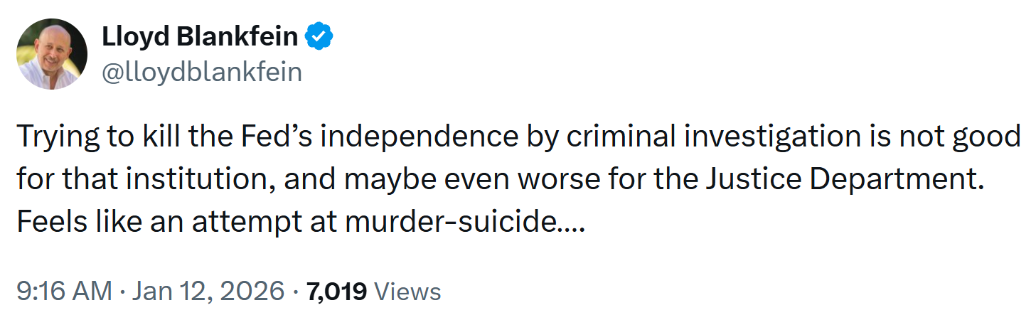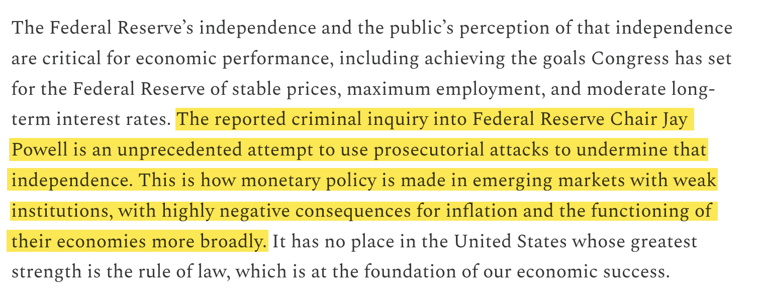 “If there were any remaining doubt whether advisers within the Trump Administration are actively pushing to end the independence of the Federal Reserve, there should now be none. It is now the independence and credibility of the Department of Justice that are in question.