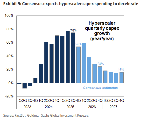 The trajectory of capex spending established this quarter will have meaningful implications for the earnings outlook and share price performance of stocks involved in the AI build-out, including the largest stocks in the index. Consensus estimates show hyperscaler year/year capex growth slowing from 75% in 3Q to 54% in 4Q and to 24% by the end of 2026. We expect AI spending will exceed consensus estimates again this quarter, but agree that a deceleration in the pace of AI capex growth is likely in 2026.