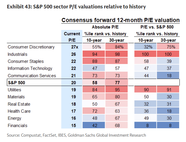 With industrial valuations at all-time highs on both an absolute and relative valuation basis and with margins near record highs, the interest in selling by their owners must be high. Also interesting to see no red shading in the figures on the Info Tech line.