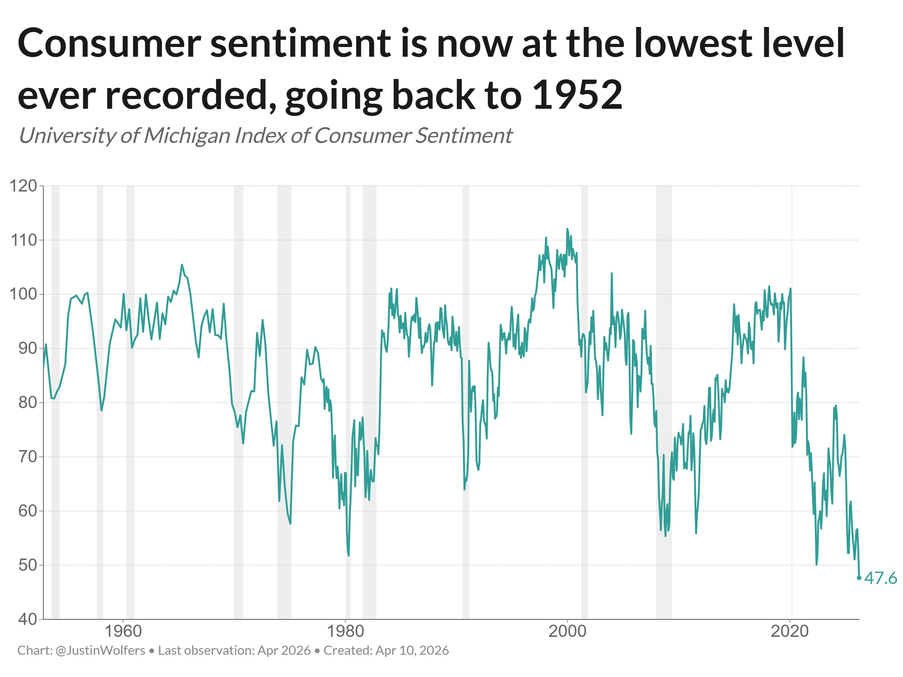 @JustinWolfers: The University of Michigan has been measuring consumer sentiment since 1952. We just got the first Iran-afflicted measure for April, and it's at the lowest level ever recorded.