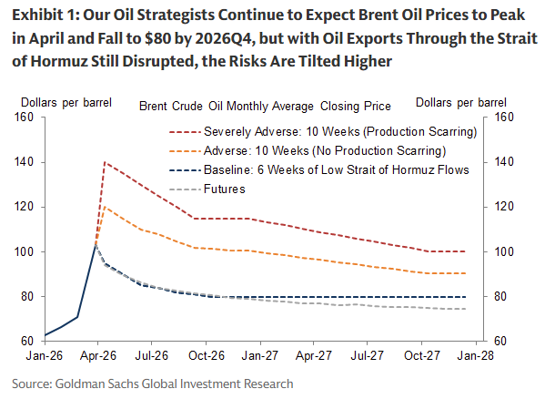 But oil flows remained depressed last week despite the ceasefire, and negotiations between the US and Iran have ended without an agreement. As a result, we continue to see the risks as tilted toward a longer disruption of Gulf exports and a higher path for oil prices. If the ceasefire does not hold and the reopening of the Strait is postponed for another month, we would expect Brent to remain at $100/bbl in 2026Q4 in an adverse scenario or $115 in a severely adverse scenario where later reopening is followed by persistent 2mb/d Mideast production losses (the orange and red lines in Exhibit 1, respectively).