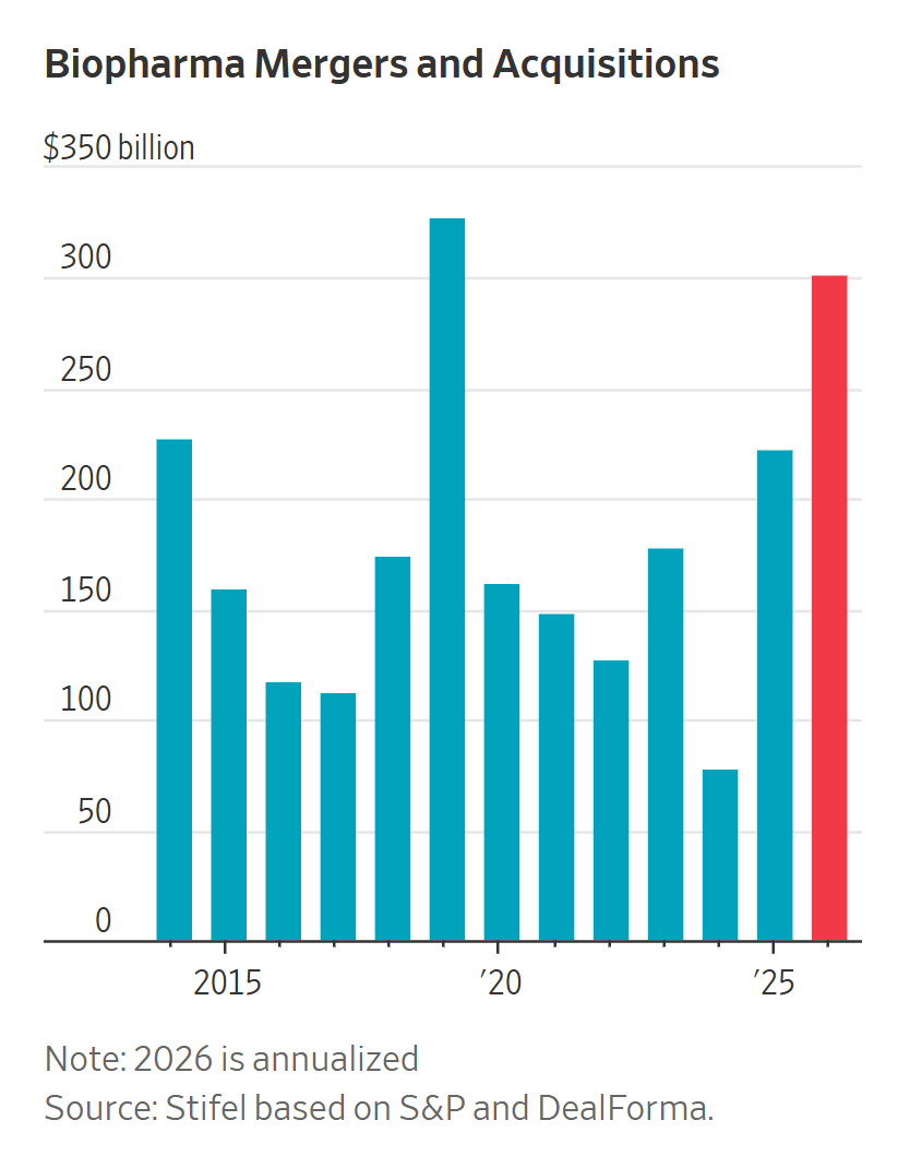 Two forces suggest the dealmaking has further to run. Pharma needs to keep buying. Of the roughly $700 billion in annual revenue generated by the world’s 14 largest drug companies, nearly half of it will face patent expiration by 2031, according to investment-bank Needham.