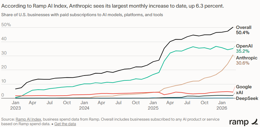 “Ramp AI Index shows business AI adoption crossed 50% for the first time in March, reaching 50.4% of businesses. A year ago, it was 35%. Half of businesses on Ramp now pay for AI. Anthropic continued its surge, growing from 24.4% to 30.6% of businesses — a 6.3-percentage-point gain, surpassing last month's record monthly gain., surpassing last month's record monthly gain. The gap between OpenAI (35.2%) and Anthropic is now just 4.6 points, down from 11 points in February. At this pace, Anthropic will overtake OpenAI within the next two months.”