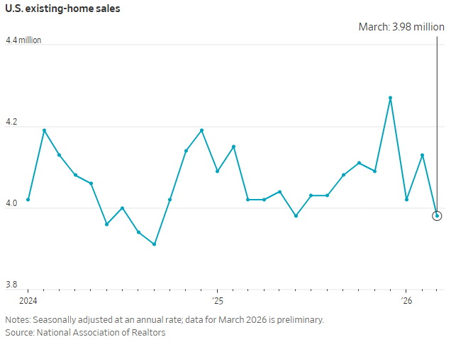 Home sales declined 3.6% in March, getting the crucial spring selling season off to a poor start as the high cost of housing and economic uncertainty held buyers back… The 3.6% month over month decline was much worse than the 1% drop economists surveyed by The Wall Street Journal forecast. It was the second largest monthly decline in the past year… The market is more sluggish in the Southeast and Southwest, where the inventory of homes for sale is above prepandemic levels. In the Northeast and Midwest, many markets are still undersupplied. The national median existing-home price in March rose to $408,800, a 1.4% increase from a year earlier, NAR said.