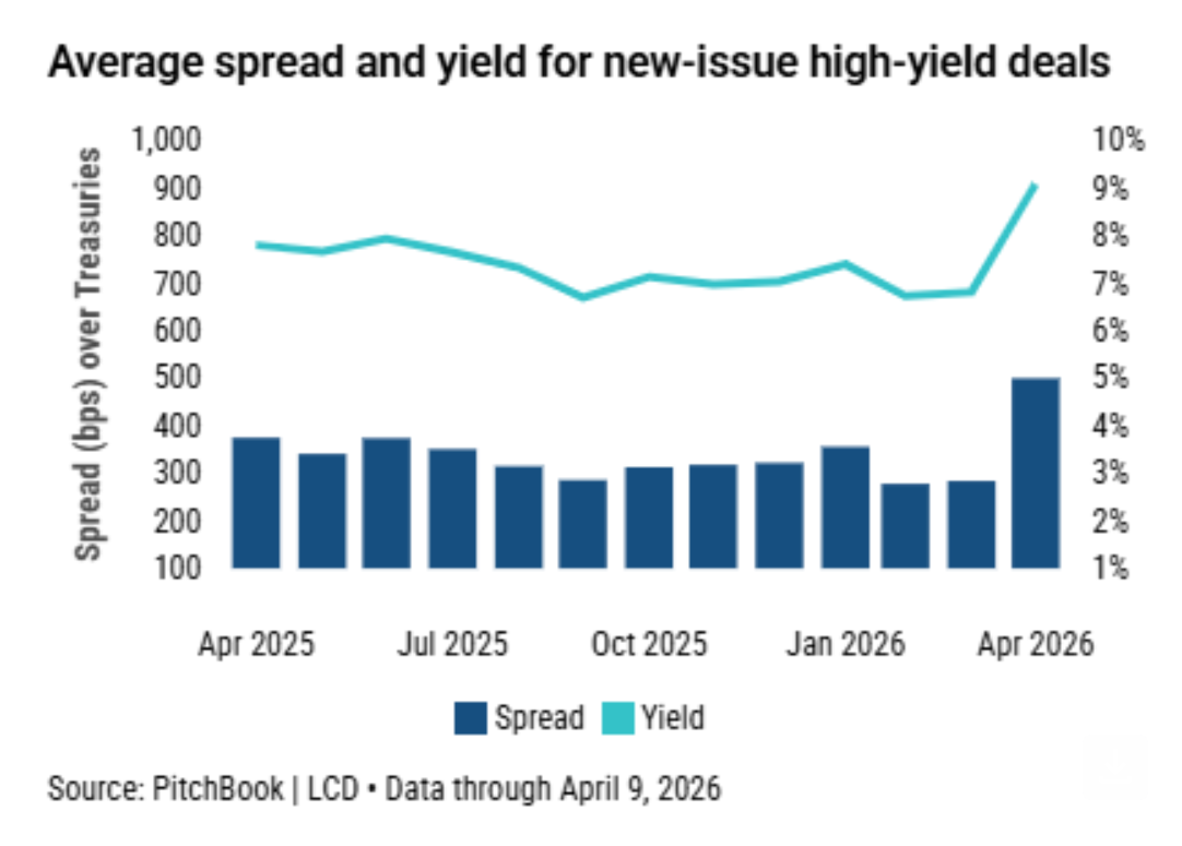 High-yield bonds are not ideally suited for inflationary pressure that has built amid the constrained flow of goods through the Strait of Hormuz, and yet the riskier issues from the lower end of the high-yield credit spectrum, which generally offer higher spreads and yields for investors, have dominated April’s high-yield business. These deals include Sealed Air (the dollar tranches of its cross-border deal are rated B+/B1 and B/B3), Univision (B/B2), Skeena Resources (B-/Caa1), and Chobani (CCC+/B3), which this week placed bonds to support a dividend recapitalization.
